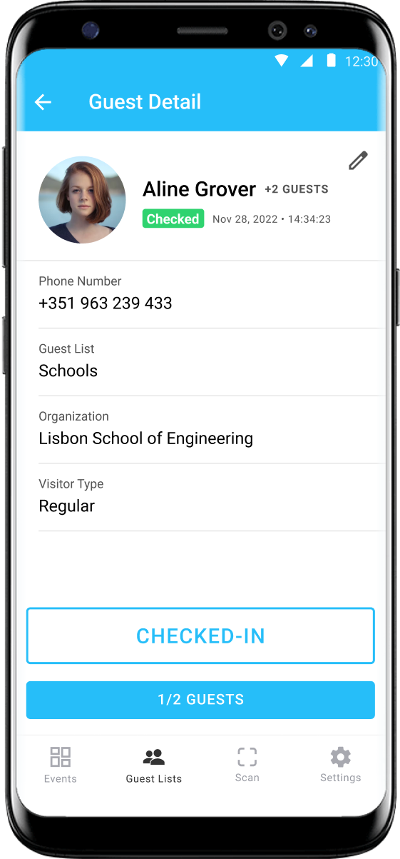 The app interface and interactions when scanning guests at events, quickly enables faster and more efficient check-in, reducing wait times and minimizing congestion at the event entrance.